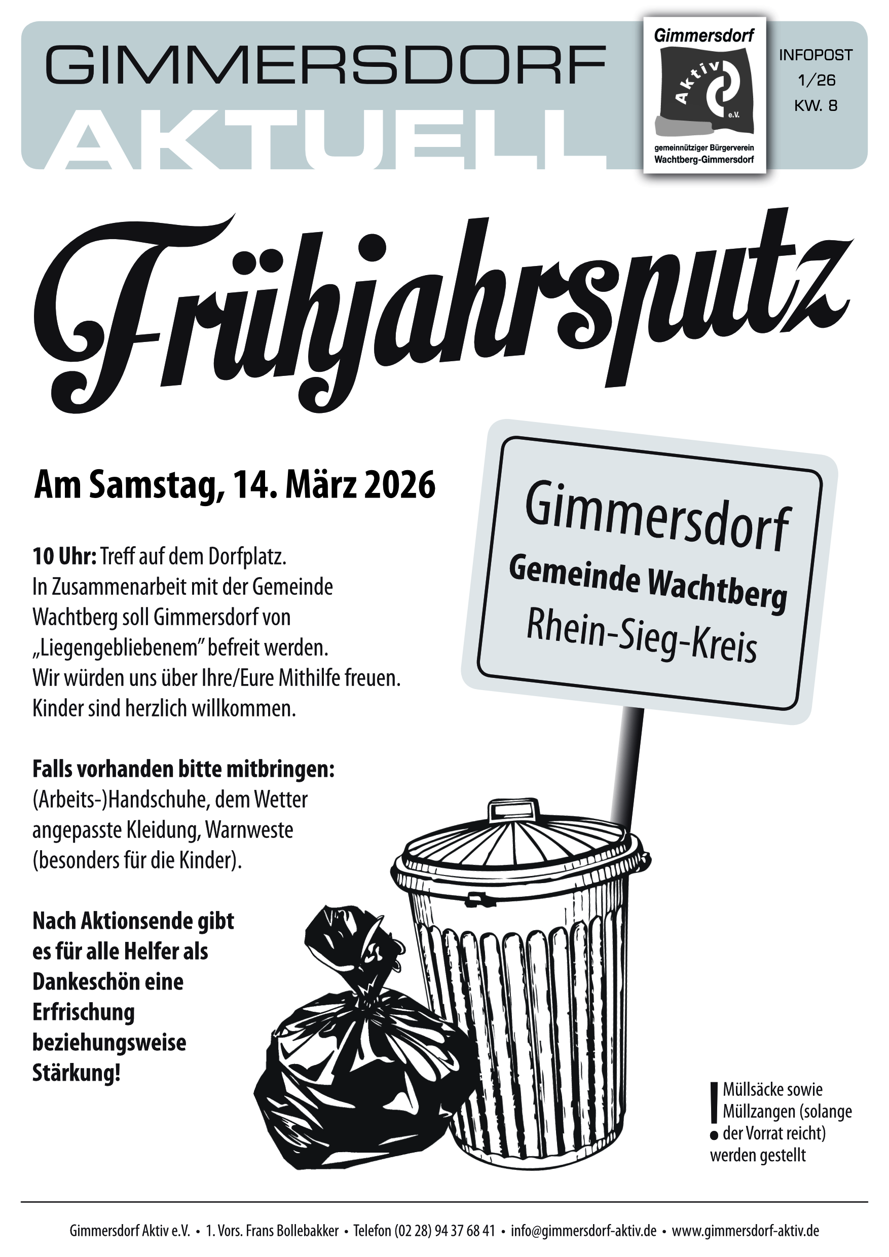 Bei strahlendem Frühlingswetter trafen sich gut 20 junge und nicht mehr ganz so junge Gimmersdorfer und Gimmersdorferinnen zum jährlichen Frühjahrsputz.